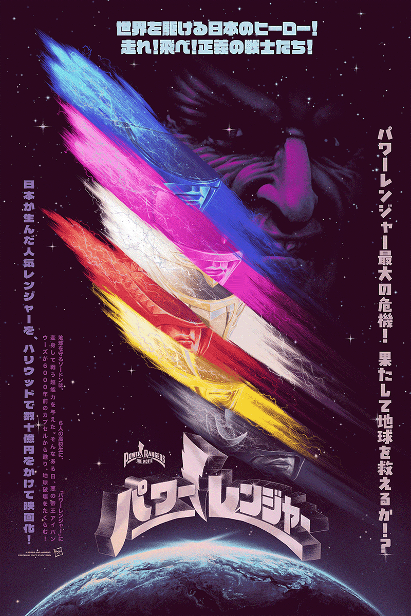 Matt Ryan Tobin brings pure ‘90s power to Bottleneck Gallery today with his latest print for Mighty Morphin Power Rangers: The Movie. Tobin’s artwork channels the energy and nostalgia of the original film, the colors streak across the cosmos like cosmic lightning, with Ivan Ooze‘s shadow looming above as the Rangers unite once more to save the world. Created in Tobin’s signature cinematic style, the composition perfectly balances chaos and symmetry, evoking the team’s power, unity, and the gargantuan scale of their fight. The release also includes a Japanese variant that amplifies the retro movie poster aesthetic with bold vertical type. Foil Giclée editions of each version will be dropping as well. All versions drop today at 12PM ET exclusively via Bottleneck Gallery.