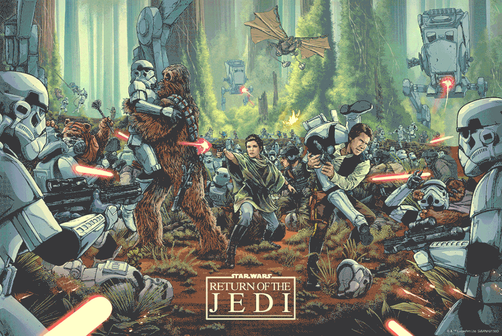 This afternoon, Jack Gregory and BNG complete the trilogy and drops his artwork for Return of the Jedi, Echoes of Endor. The series originally began with Boarding Party all the way back in October of 2021. It’s a gorgeous print showing the opening of the first film and is still one of our favorite Star Wars prints. The foil edition is great as well as the artwork lends itself nicely to the reflective paper. Then in April of ’23 Gregory and BNG followed up with the Empire Strikes Back version, titled Uninvited Guests, which focused on the battle of Hoth. Which bring us back to today and the final print. What is unique about this series is the fact that it completely avoids one of the key themes of the Star Wars franchise, the Jedi, the Sith and Force. This final print also includes some of the main characters, which were absent from the other prints. As with the others, Echos of Endor will drop in both regular foil screen print editions, along with an lenticular edition. These are on sale today at 12PM ET via Bottleneck Gallery.