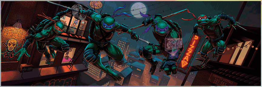 First up is MonkeyMouth, who has created radical TMNT artwork in the past. His latest is a wide, rooftop chase scene featuring all four turtles leaping across the city skyline under a glowing full moon. The neon pizza sign, fire escapes, and deep night blues give it that classic animated vibe. It will be available as a Regular Giclée, Foil Variant, and Multi-Layer Acrylic.